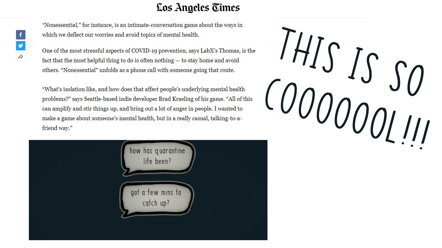 NONESSENTIAL is an Off-beat Comedic Drama About Mental Health and Life During a Pandemic.My goal was to create a game that people could really resonate with. It was really challenging creating a game that handles such serious topics such as mental health and COVID-19 however I believe I handled the topics well. It has been really rewarding to see all the support and positive reviews the game has gotten and I'm so happy the game has been able to help people.I went into creating NONESSENTIAL with the goal that ONE person would be positively affected by it and I'm honored that ONE turned into MANY.Play NONESSENTIAL on itch.io!